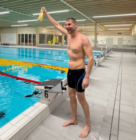 Maarten heeft het record achteruit zwemmen verbroken. In acht uur heeft Maarten 17000 meter achteruit gezwommen.